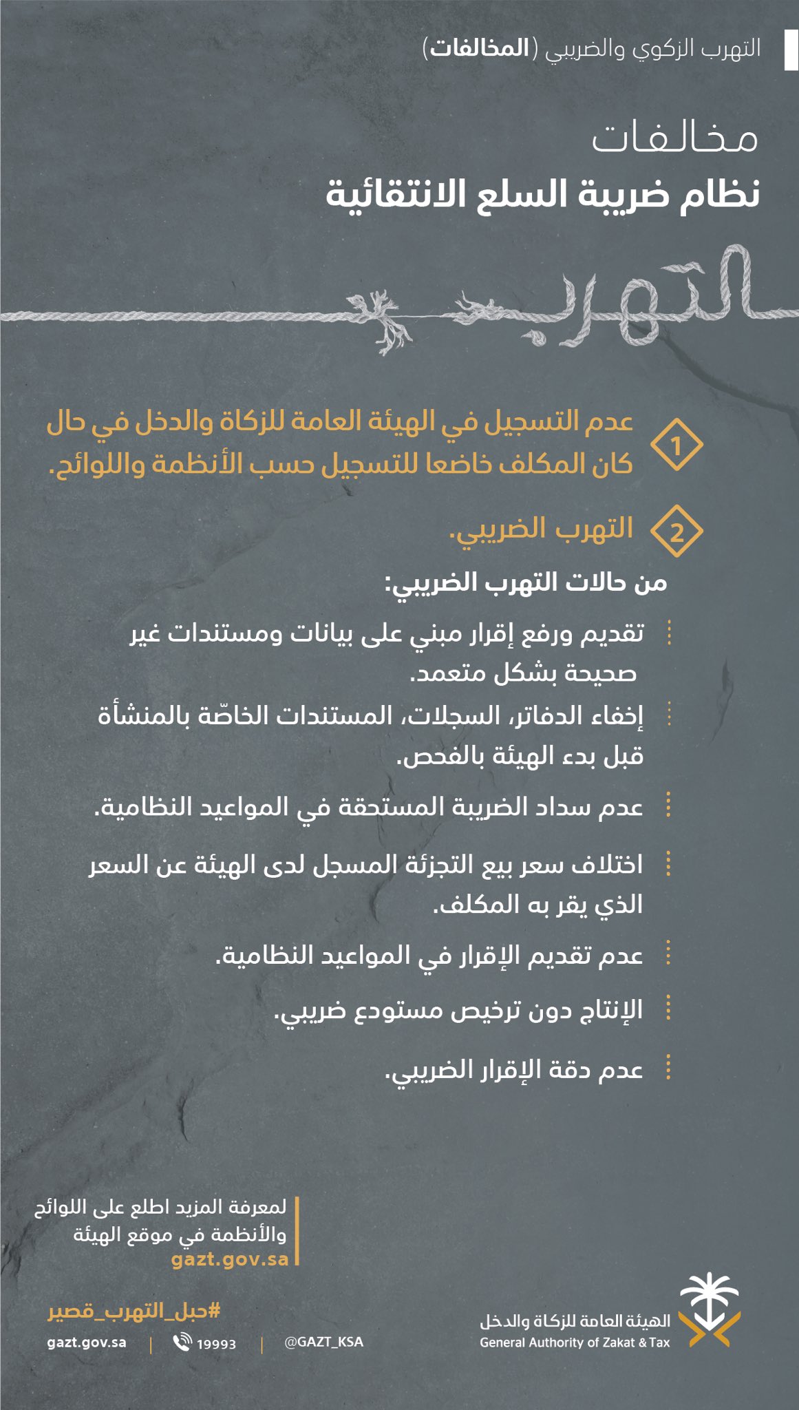 الهيئة العامة للزكاة والدخلさんのツイート مخالفات التهرب الضريبي في نظام ضريبة السلع الانتقائية حبل التهرب قصير